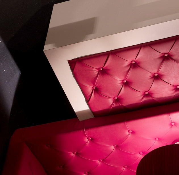 Il locale ha anche un’area privè, con pareti in boiserie imbottita e poltroncine in rosso brillante.